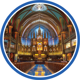 | The color of French Canada’s Laurentian Mountain range during autumn foliage is the backdrop for the majesty of Quebec’s sacred Shrines and historic Cathedrals. |