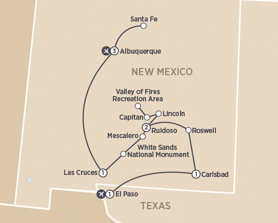 9 DAYS • 16 MEALS Discover the spirit of the Southwest on this immersive New Mexico adventure. Explore Albuquerque and Santa Fe, ride the Sandia Peak Tramway, and marvel at White Sands and Carlsbad Caverns. Journey through Billy the Kid country, Roswell’s UFO lore, and historic frontier towns, enjoying authentic cuisine, cultural treasures, and breathtaking desert landscapes throughout.