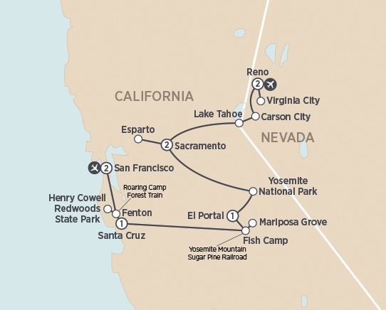 9 DAYS • 13 MEALS Tour San Francisco, drive the beautiful Pacific Coast and experience the majestic Redwood and Sequoia trees of California. Ride the Roaring Camp Forest Train through Henry Cowell Redwoods State Park and the historic Yosemite Mountain Sugar Pine Railroad with included lunch. Take a narrated Valley Floor Tour of Yosemite National Park and cruise on the turquoise waters of Lake Tahoe. Visit the historic towns of Carson and Virginia Cities.