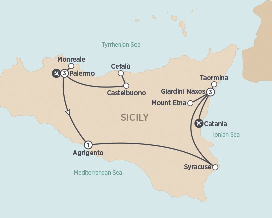 9 Days • 12 Meals Witness the diversity of Sicily while discovering this largest island in the Mediterranean Sea. From the capital city of Palermo to the hilltop town of Taormina; from the medieval village of Castelbuono to majestic Mount Etna; from historic ruins in Agrigento to ancient treasures on Ortygia Island. Add ancient temples, dazzling mosaics, and dramatic coastlines for a journey around Sicily that is sure to please.